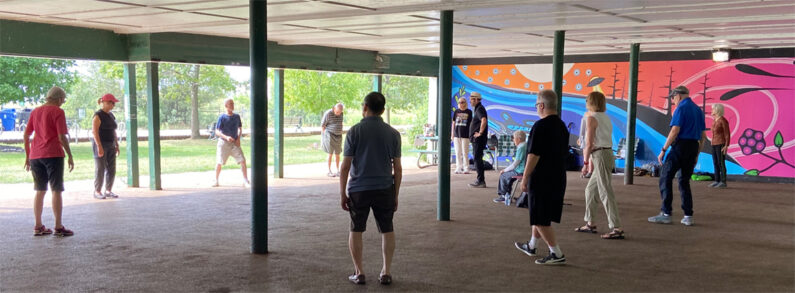 We meet beside the trail at the covered area and practice there for shade or shelter.