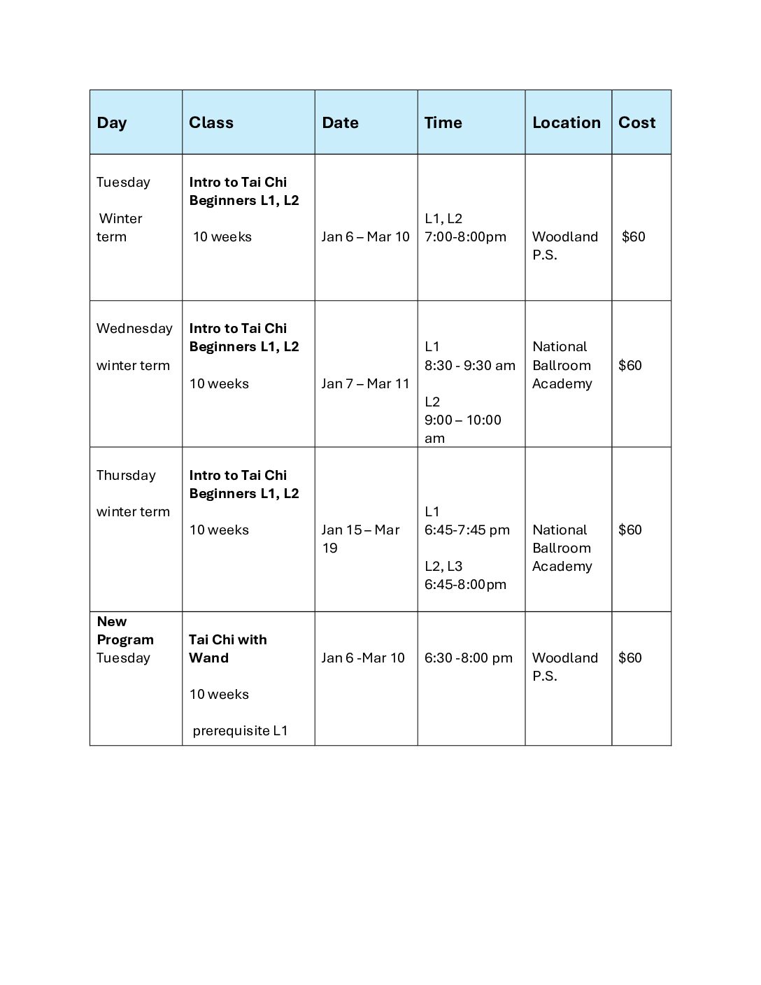 The Tue evening Beginners Program is now starting on Jan 13 instead of Jan 6, 2026 at Woodland P.S.